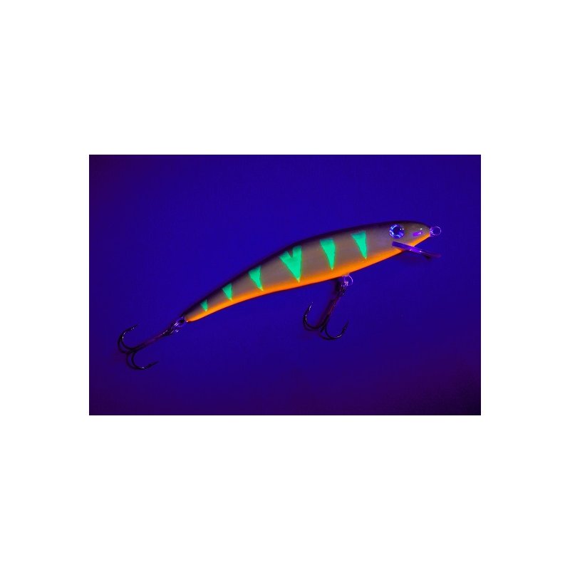 ?UV aktiv? lautet mittlerweile das Schlüsselwort für mehr Fangerfolg beim Kunstköderangeln. Speziell in trübem Wasser, an trüben Tagen sowie in der Dämmerung und nachts wirken die UV aktiven Farben wie ein Restlichtverstärker auf die Fische. Man muss sich das so vorstellen: In der Dämmerung sind graue Katzen schwer auszumachen, während eine weiße Katze klar hervorsticht ohne unnatürlich zu wirken. Wäre sie mit einem Licht bestückt, würde sie zwar auffallen, aber völlig unnatürlich aussehen. Und genau so ist auch mit UV-aktiven Wobblern; sie stechen bei o.g. Lichtverhältnissen raus ohne Misstrauen zu erwecken. Neben den grellen UV Farben gibt es auch die ?UV Confidential? Modelle mit natürlichen Farben und unsichtbarem UV Lack. Erst wenn sie mit Schwarzlicht angeleuchtet werden sieht man eindrucksvoll den UV Lack.